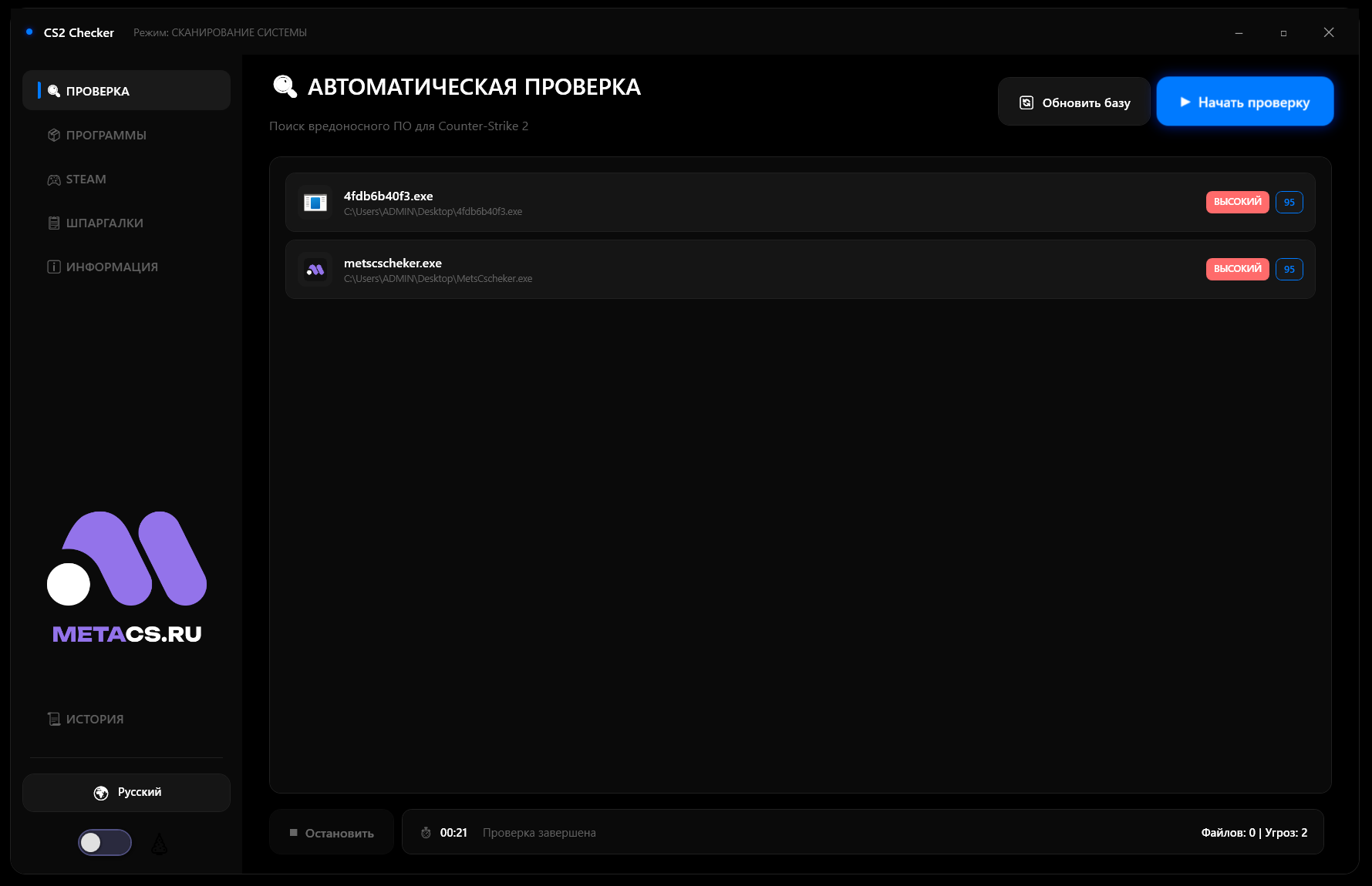 Детект остаточных файлов и записей, свидетельствующих о том, что читы запускались ранее, даже если они были удалены перед проверкой.